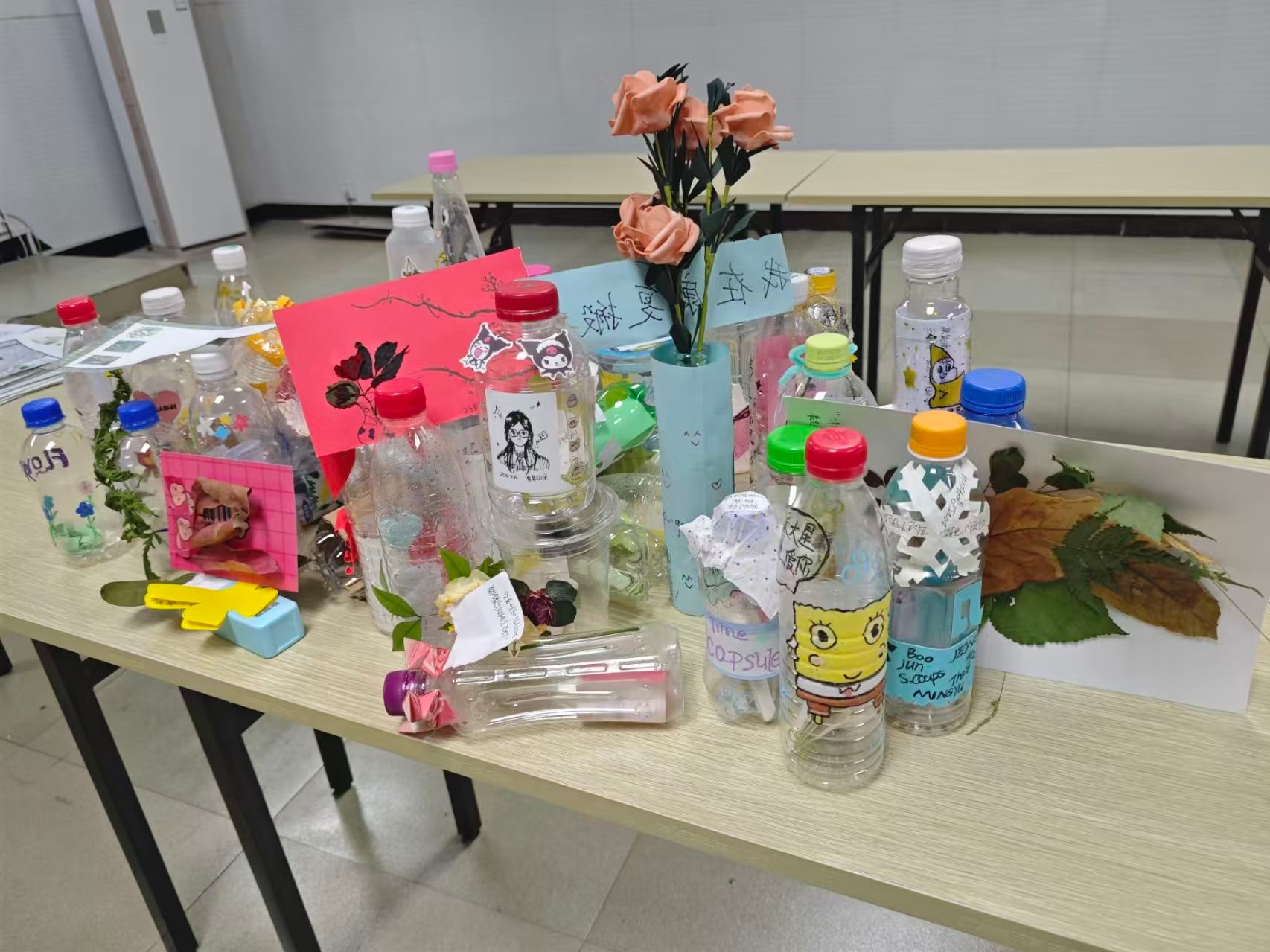 活动设置两大创作任务,参与者可灵活选择:活动一为制作时光胶囊瓶:用废塑料瓶封存手写的学业目标与心情感悟,瓶身手绘或粘贴装饰,让闲置容器成为"青春记忆储蓄罐";或用周边掉落的树叶、花朵DIY明信片;活动二则需用彩色卡片创作主题不限的剪纸,并粘贴在指定纸张上。所有作品需附200字手写创作感想,同学们在记录中回溯材料收集的惊喜、制作过程的专注与成品诞生的成就感。最终,百余件充满巧思的作品集中陈列于小实训室,废旧材料在创意加持下焕发独特光彩。