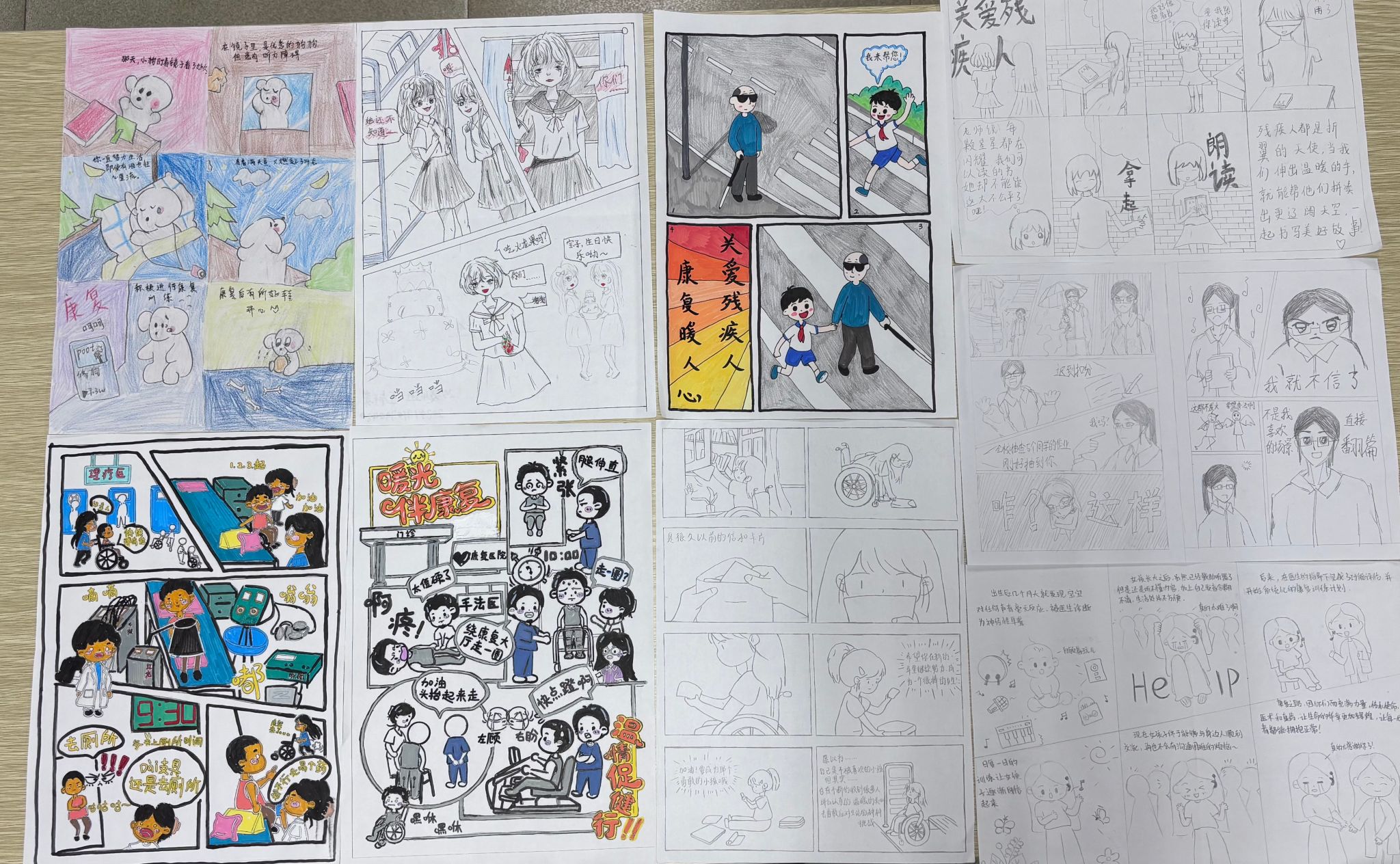 活动期间,同学们热情投入创作,有的漫画描绘了志愿者俯身帮轮椅上的患者调整靠背的温馨场景;有的定格志愿者搀扶残疾人慢慢迈步的温暖画面,传递出陪伴的温情;还有作品描绘康复治疗师指导残疾人做康复训练的场景,展现出坚持的力量。这些漫画作品,犹如一颗颗璀璨的星辰,不仅闪耀着独特的创意光芒,更承载着同学们对康复精神的深刻思考与感悟。每一幅作品,都是对残疾人尊严的崇高致敬,是对生命顽强不屈精神的真挚诠释,它们如同一股股暖流,流淌在同学们的心间,唤起康复学子对残疾人群体的关注与关爱。